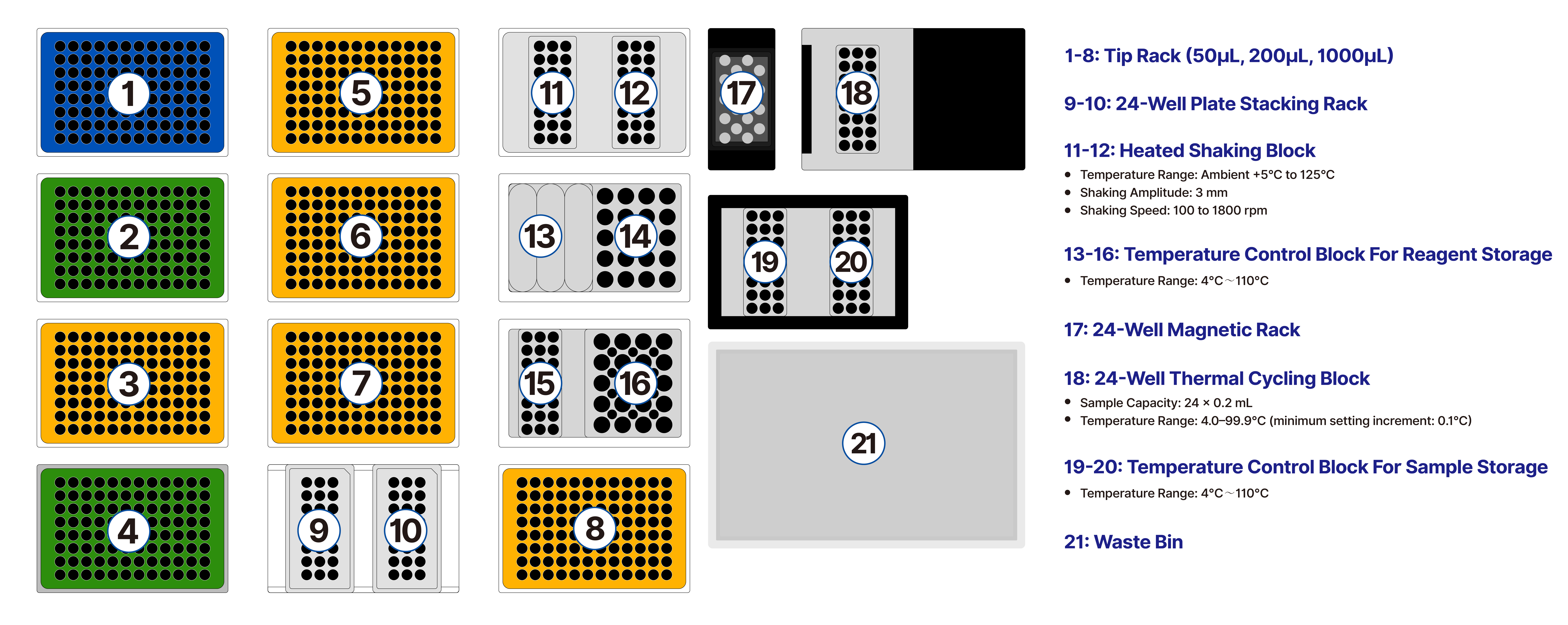 In NGS sequencing experiments, library preparation is a key step for ensuring high-quality sequencing data. However, the process is often complex and requires a high level of technical expertise, making it a major bottleneck in sequencing workflows. An automated liquid handling workstation can precisely transfer microliter volumes, standardize experimental procedures, and significantly improve accuracy and reproducibility, while greatly reducing the difficulty and cost of pre-sequencing library preparation. Bioer’s Automated Liquid Handling Workstation– PreFlex 100 is a stand-alone, benchtop system with a modular design that includes PCR, temperature control, magnetic separation, and other multifunctional modules to minimize manual intervention. Its HEPA filtration and UV sterilization systems effectively reduce the risk of cross-contamination.